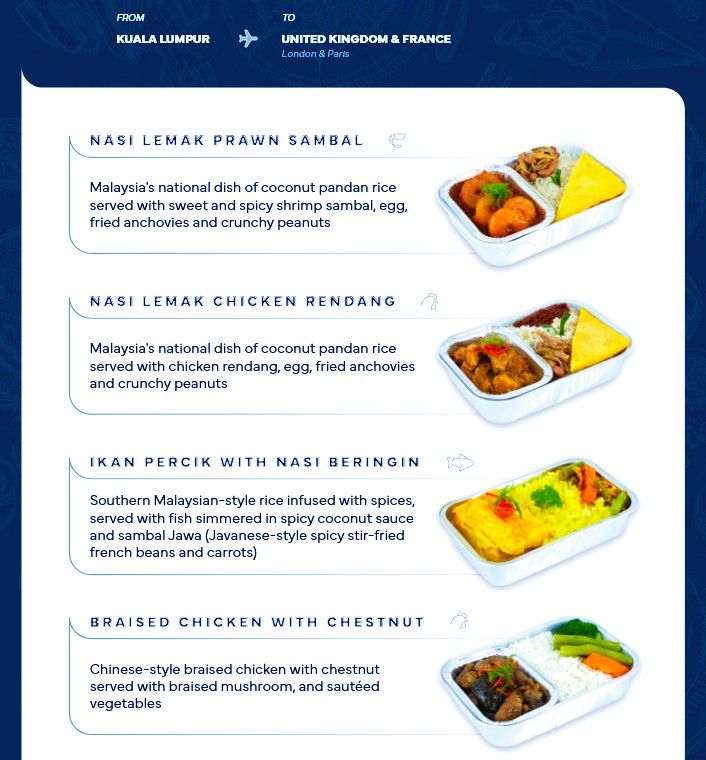 La compagnie propose diverses options : la réservation du salon Malaysia Airlines dans le satellite international ou en jetée réservée aux vols régionaux coûte l’équivalent de 60 euros (290 RM). Il est possible aussi de commander un plat différent du menu standard. La réservation peut être effectuée jusqu’à 24 heures avant le décollage. La compagnie propose en ligne 10 plats différents, UNIQUEMENT au départ de Kuala Lumpur. Ce service est gratuit…